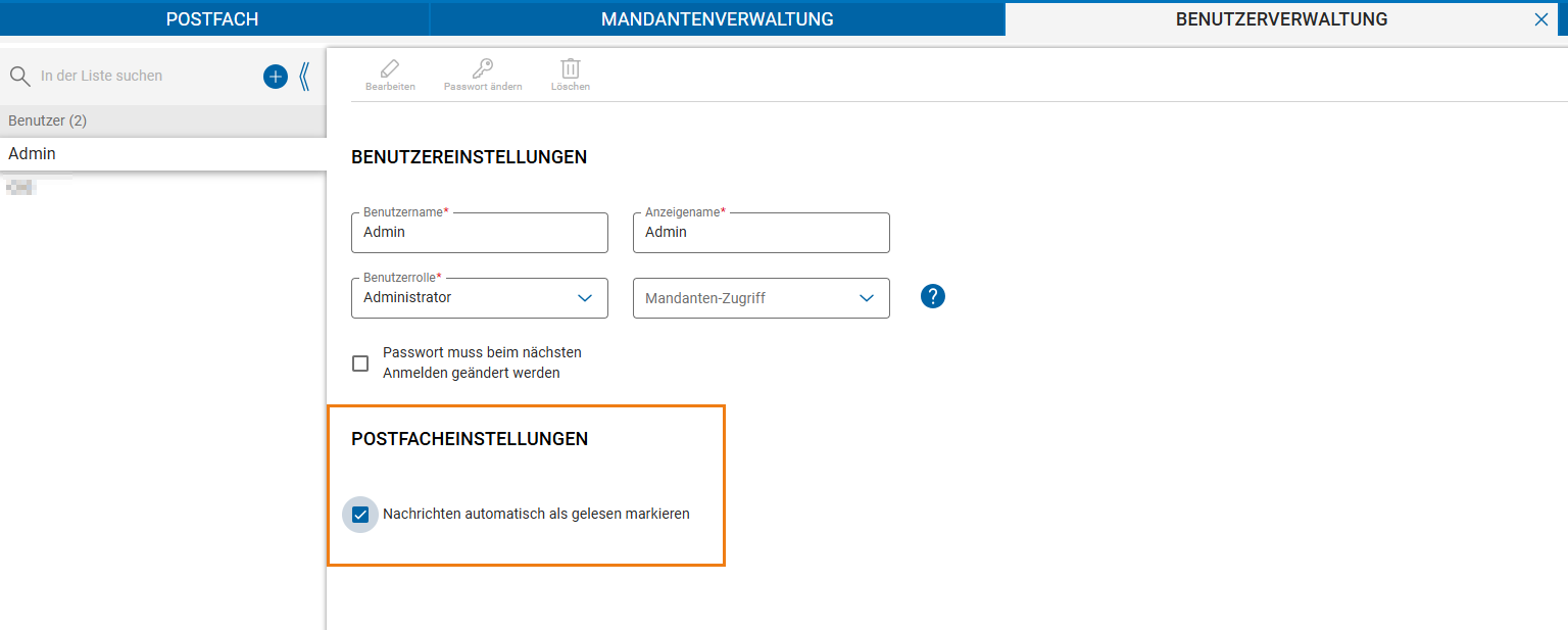 In den Einstellungen der C-BOX kann ab eingestellt werden, ob Nachrichten im Postfach durch Anklicken automatisch als gelesen markiert werden sollen oder ob ein manueller Schritt dafür notwendig ist. Dazu wechseln Sie in die Einstellungen der C-Box unter Postfacheinstellungen (in der Benutzerverwaltung) und aktivieren bzw. deaktivieren das Kontrollkästchen Nachrichten automatisch als gelesen markieren.