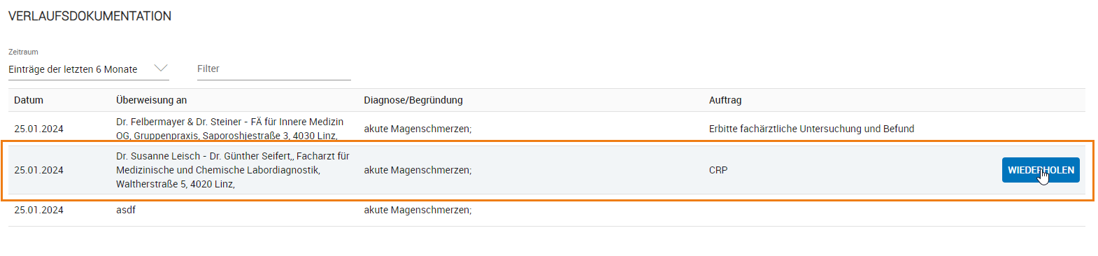 In der Rubrik VERLAUFSDOKUMENTATION werden alle vergangenen Überweisungen (der letzten 6 Monate) aufgelistet. Der Filter kann im Anlassfall geändert werden. Ebenso kann im Textfilter nach dem überweisenden Arzt gefiltert werden. Wird in der Verlaufsdokumentation der Mauszeige über eine Tabellenzeile bewegt, wird im rechten Bereich der Tabellenzeile ein Button eingeblendet, um eine vergangene Überweisung zu WIEDERHOLEN. In diesem Fall wird werden die Informationen der alten Überweisung kopiert. Gewünschte Änderungen können vorgenommen werden und die neue Überweisung kann gespeichert werden.