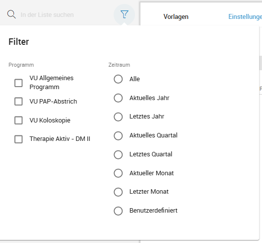 Mit Version 25.4. wurde im Bereich Vorsorge/DMP die Filterung nach dem VU-Programm und nach Datum ergänzt. Zusätzlich wird das jeweilige VU-Programm in der Liste um laufenden und abgeschlossenen VUs ergänzt.