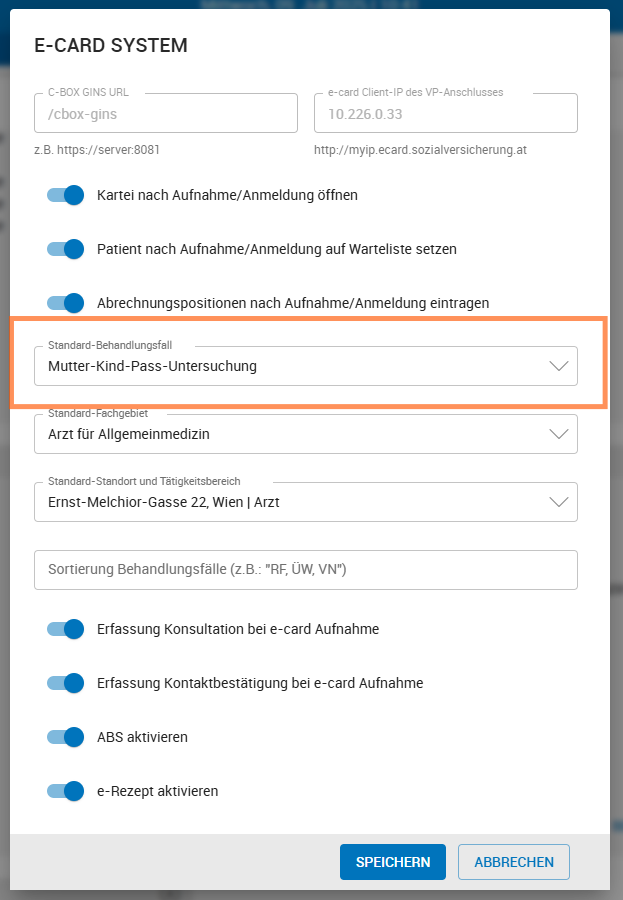 Im Menü Einstellungen > Praxis > Abrechnungsbereich > e-Card-Einstellungen kann ein Standard-Behandlungsfall hinterlegt werden. Dieser wird beim Anmelden eines Patienten mit e-Card automatisch vorausgewählt.