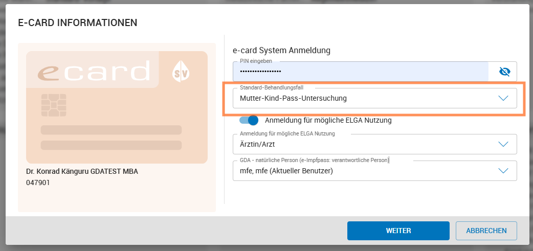 Die Anmeldung am e-card System ist als Option vorausgewählt und mit dem Button WEITER können Sie die PIN eingeben und bestätigen.