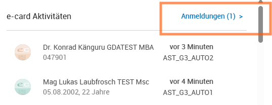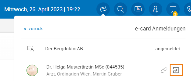 Soll eine e-card Anmeldung beendet werden, können Sie im e-card Popper die aktiven Anmeldungen anzeigen und die gewünschte Admin-Karten-Anmeldung mit beenden.