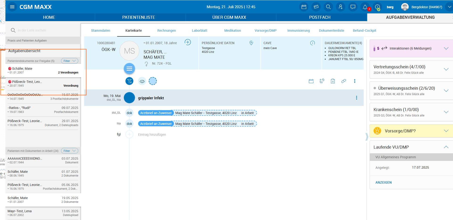 In der Aufgabenliste werden Patienten mit zu vidierenden Verordnungen berücksichtigt. Patienten mit zu vidierenden Verordnungen werden priorisiert angezeigt und die Filterung nach Dokumentenart ist möglich.