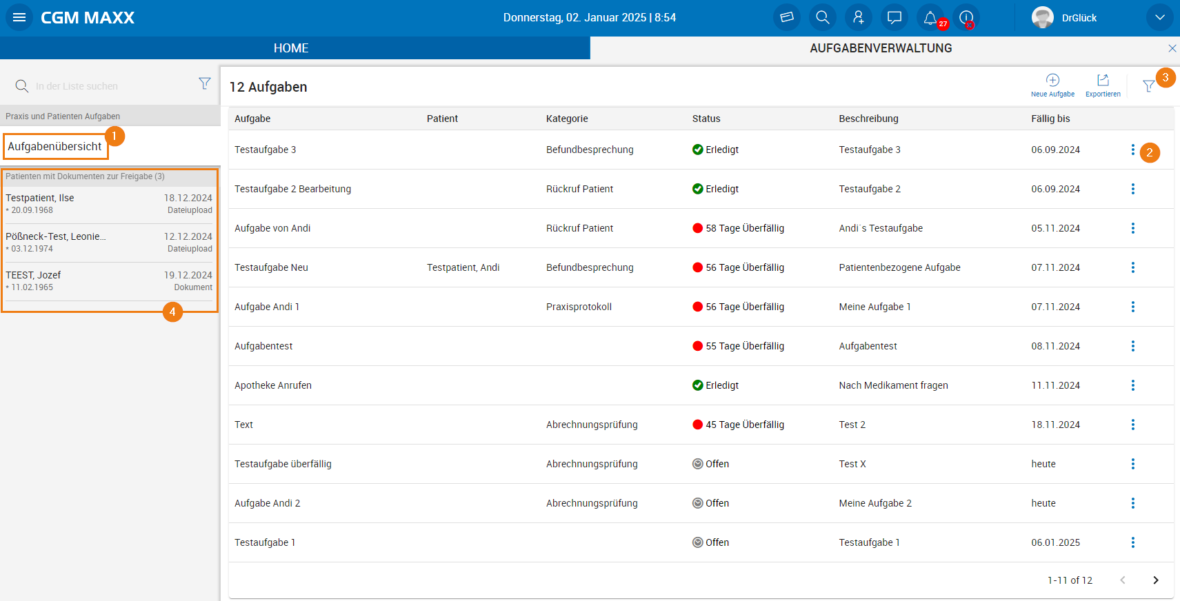 Über MENÜ > Aufgabenverwalten erhalten Sie eine Übersicht über alle Aufgaben Ihrer Praxis.