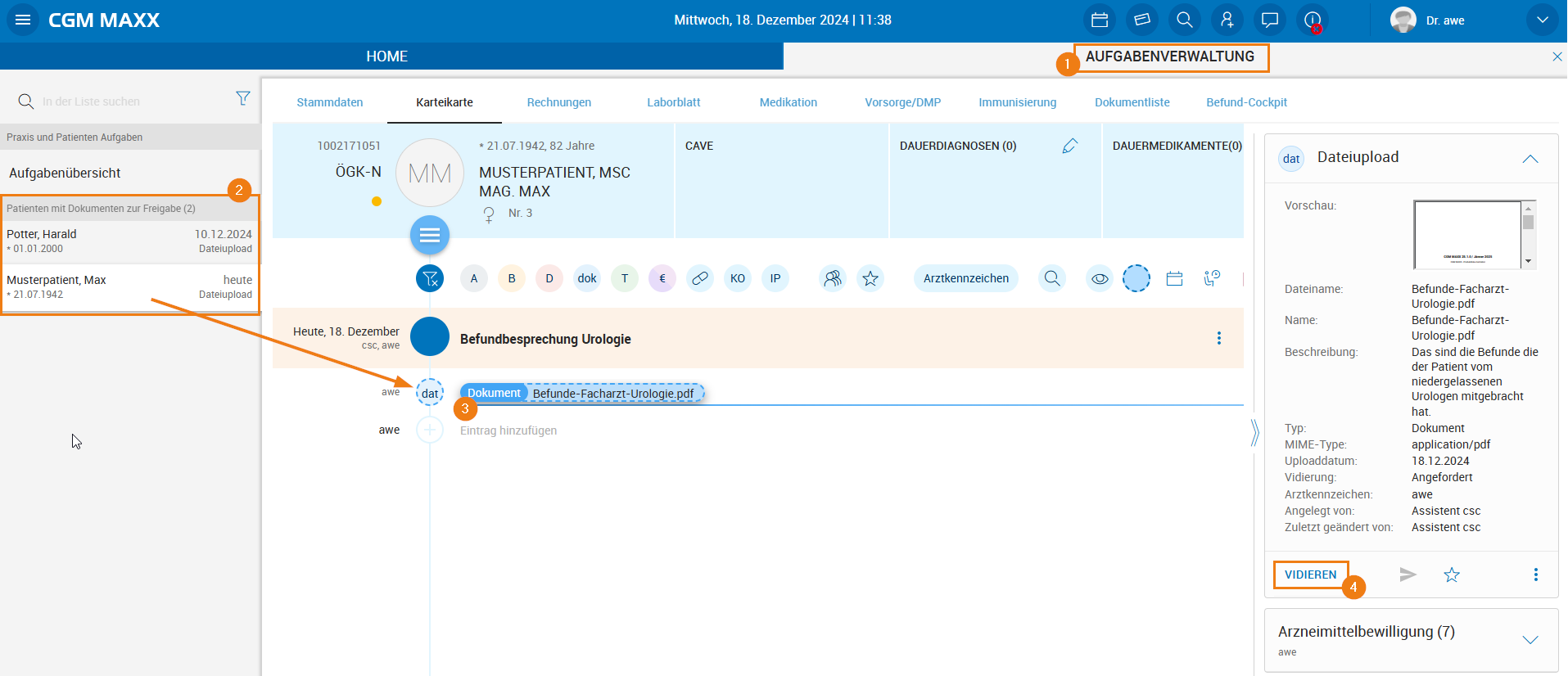 Patienten mit angeforderten Vidierungen erscheinen automatisch in der Aufgabenliste „Patienten mit Dokumenten zur Freigabe“ und Mitarbeiter mit der entsprechenden Berechtigung zum „Dokumente vidieren“ können die Dokumente prüfen und final in der Kontextkarte über den Button „VIDIEREN“. Damit verschwindet das jeweilige Dokument aus der Aufgabenliste. Der Zeitpunkt der Vidierung und der durchführende Mitarbeiter sind über die Kontextkarte des jeweiligen Eintrages sichtbar. Darüber hinaus kann über die Funktion "Verlauf" aus der Kontextkarte die vollständige Bearbeitungs- und Freigabehistorie nachvollzogen werden.