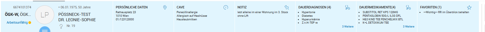 Patientenheader mit verschiedenen Informationen zum Patienten, wie Versicherungsdetails, Cave, Dauermedikamente, Dauerdiagnosen, Termine etc. |