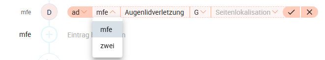 - Geben Sie den Namen des Diagnosetyps in eine Zeile der Sitzung ein oder verwenden Sie den Shortcut strg+↓. Ihnen wird in einer Dropdown-Liste der entsprechende Eintragstyp vorgeschlagen.Dropdownmenümit Auswahlmöglichkeiten.