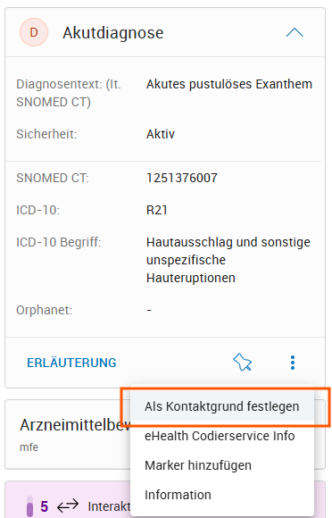 In der Kontextkarte der Diagnose kann mit der Funktion "Als Kontaktgrund festlegen" die Diagnose mit dem entsprechenden Kennzeichen als Kontaktgrund markiert werden. Die bisher als Kontaktgrund versehene Diagnose verliert dann automatisch das Kennzeichen.