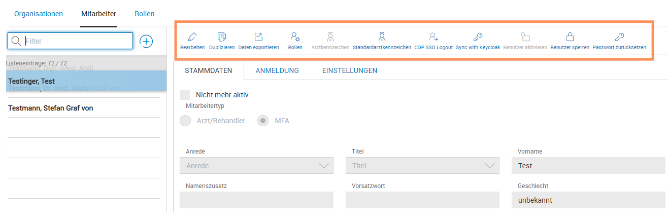Die Mitarbeiterverwaltung dient dazu, die Stammdaten der Benutzer des Systems, deren Anmeldeeinstellungen sowie Rollen- und Arztkennzeichenzuordnungen zu pflegen.