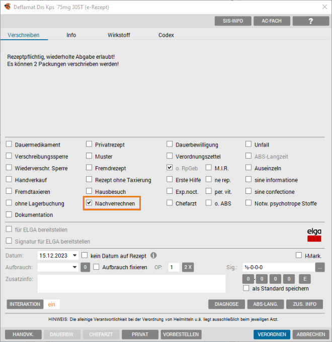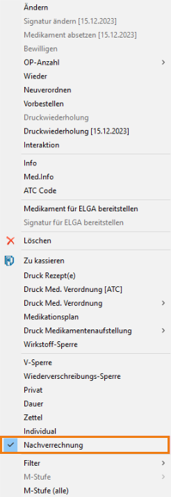 A: | Wird ein Rezept für für das vorherige Abrechnungsmonat eingetragen, setzen Sie bitte auch das Flag "Nachverrechnung". Dies kann im Verordnungsfenster oder im Kontextmenü des Medikamenteneintrags erfolgen. Hinweis Im Kontextmenü kann das Flag "Nachverrechnung" auch bei e-Rezepten im Nachgang gesetzt werden. Damit ein Medikament erfolgreich nachverrechnet werden kann, muss zusätzlich auch die Abrechnungsnummer zurückgesetzt werden ("HAPO Abrechnungsnummer zurücksetzen" im Kontextmenü). Ansonsten scheint das nachzuverrechnende Medikament nicht in der Abrechnungsliste auf. |