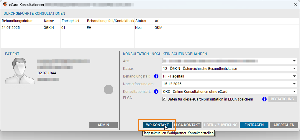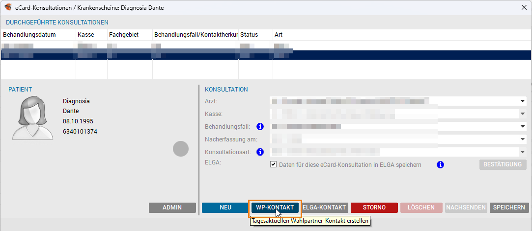 Bei vergessener e-card gelangen Sie über die SVNR-Suche ebenfalls in den Konsultationsdialog, in dem Sie anstatt einer Konsultation einen Wahlpartner-Kontakt mit dem Button [WP-KONTAKT] erfassen können: