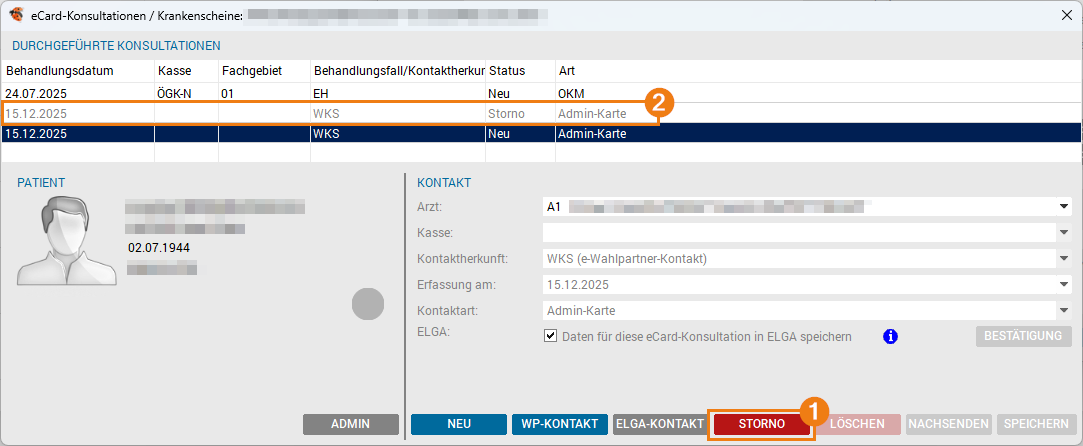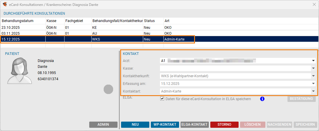 e-Wahlpartner-Kontakte werden gemeinsam mit den Konsultationen in der Konsultationsliste angezeigt. Die Kontaktherkunft ist jeweils "WKS", die Kontaktart weist aus, ob der Kontakt mittels e-card oder Admin-Karte erfasst wurde: