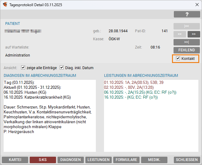 Analog zur Abrechnung ist es im Tagesprotokoll nun möglich, Kontaktgründe von der Prüfung auszunehmen. Die Checkbox "Kontakt" steuert, ob fehlende Kontaktgründe bei der Prüfung berücksichtigt werden: