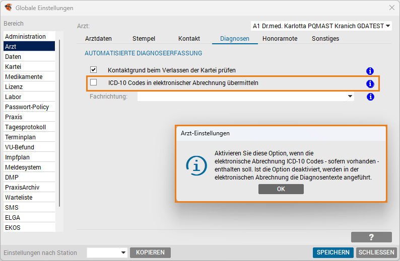 Es gibt nun eine Einstellung unter SETUP – GLOBAL – ARZT – DIAGNOSEN mit der Bezeichnung „ICD-10 Codes in elektronischer Abrechnung übermitteln“, mit welcher gesteuert werden kann, ob in elektronischen Abrechnungen ICD-10 Codes enthalten sein sollen.