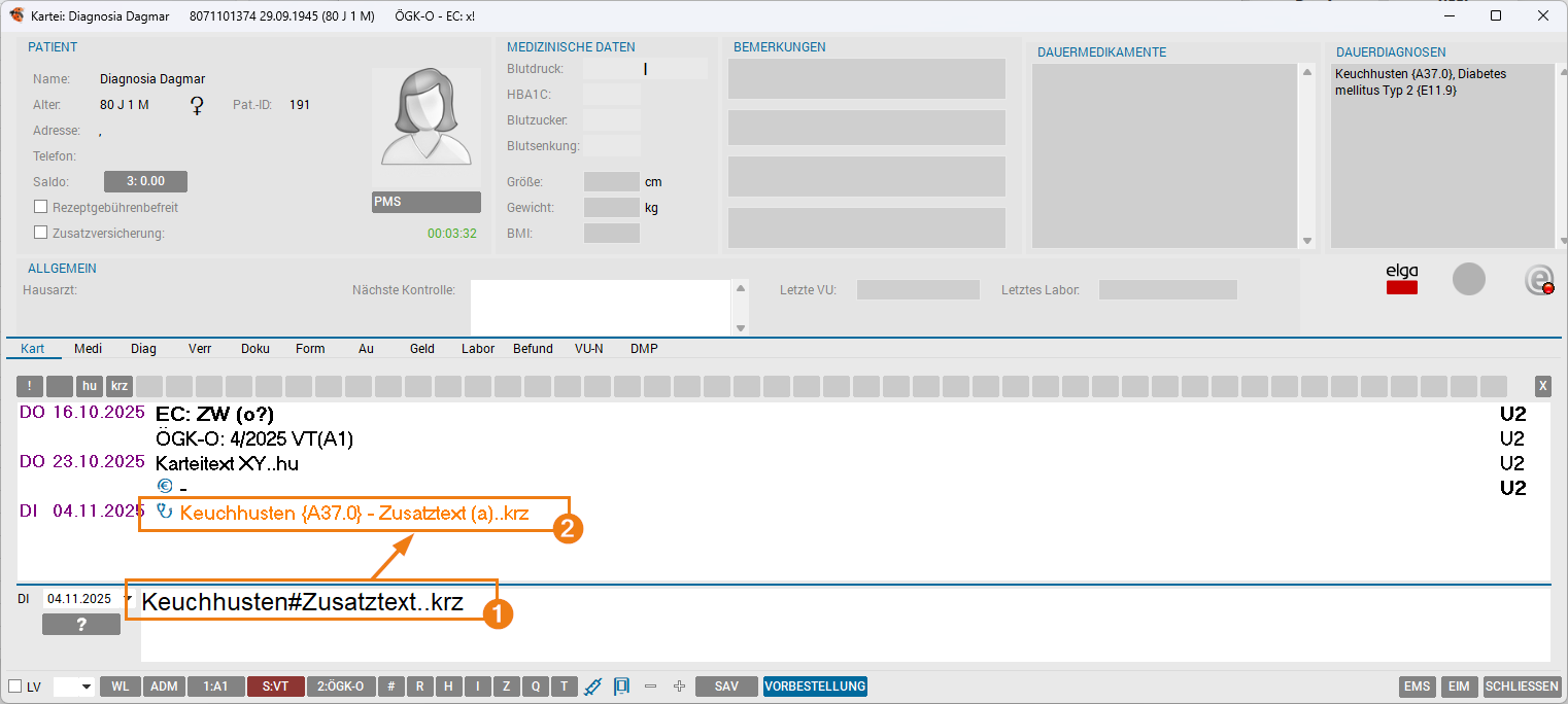 Wenn ein Zusatztext vorhanden ist, so wird dieser auch in der Kartei dargestellt. Für bestehende Diagnosen wird dies erst nach einem Karteirefresh aktualisiert.