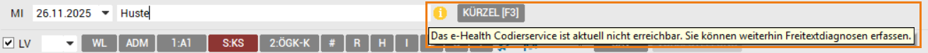 - Integration e-Health Codierservice: Ist das e-Health Codierservice aktuell nicht erreichbar, wird dies jedenfalls im Diagnosenreiter angezeigt. Freitextdiagnosen können weiterhin ungehindert erfasst werden.