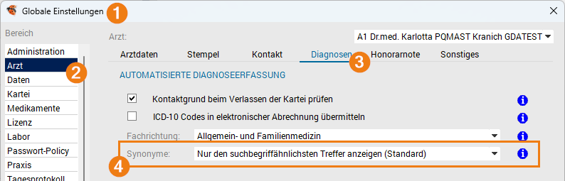 Ob und wie Sie Synonyme verwenden möchten, können Sie über die Einstellung "Synonyme" unter SETUP – GLOBAL – ARZT – DIAGNOSEN definieren: