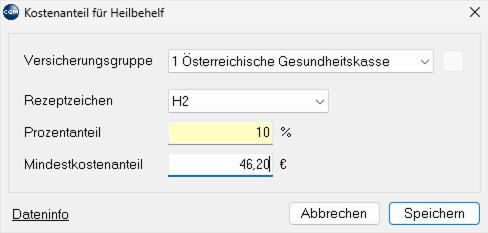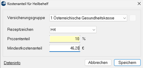 Wählen Sie dann die Versicherungsgruppe (gilt für ÖGK, BVAEB-EB, BVAEB-OEB, SVS-GW, SVS-LW und KFA Wien) und ändern den Selbstkostenanteil bei H2 und H4 auf den oben angegebenen Wert.