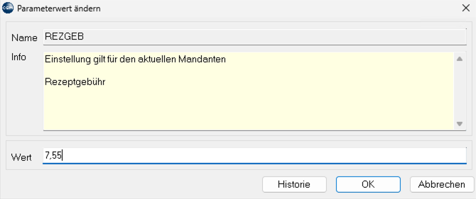 Die Rezeptgebühr kann in der Parameterwartung (meist in der Toolbar, sonst den Menüpunkt "7 - Benutzerdienste" > "2 - Programmparameter" auswählen) kontrolliert und ggf. angepasst werden. In der Gruppe „Medikamente“ finden Sie an erster Stelle den Parameter „REZGEB“, dessen Wert Sie mit Doppelklick ändern können.