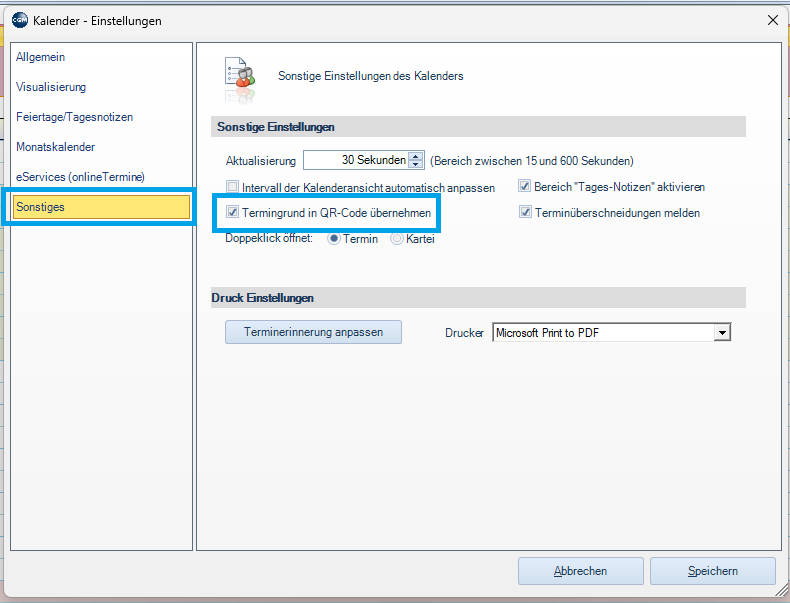 Im TMS (Termin-Management-System) kann nun in den Einstellungen entschieden werden, ob der Termingrund in den QR Code übernommen werden soll oder nicht.