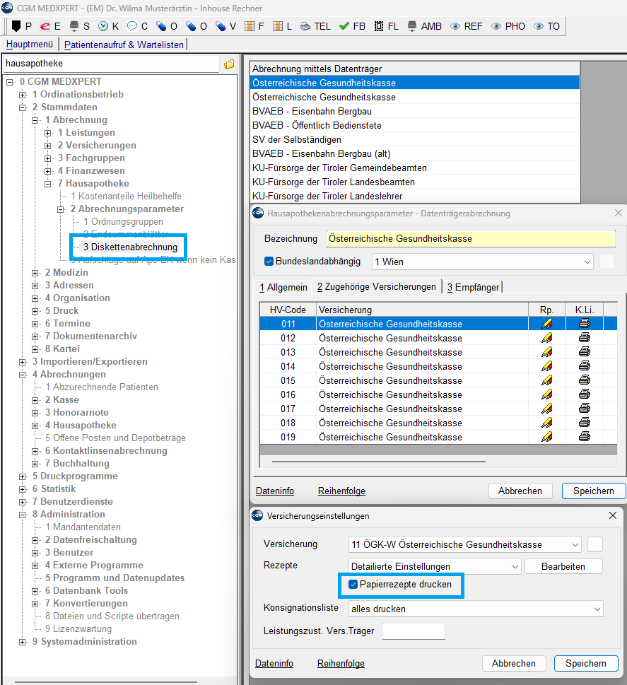 Die Einstellung kann über das Hauptmenü → 2 Stammdaten → 1 Abrechnung → 7 Hausapotheke → 2 Abrechnungsparameter → 3 Diskettenabrechnung angepasst werden.