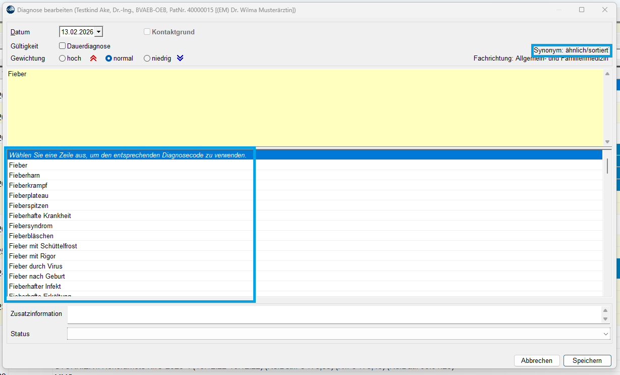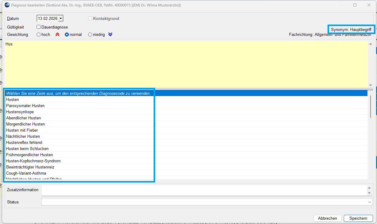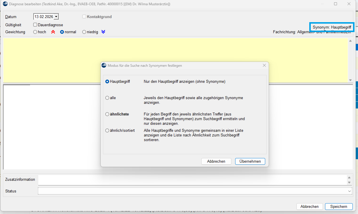 Die Einstellung kann mit einem Klick auf Synonym im Diagnosen-Fenster jederzeit angepasst werden.