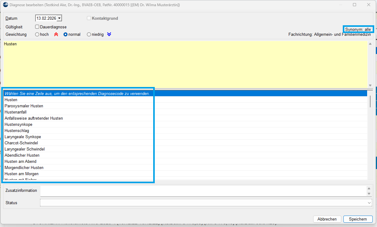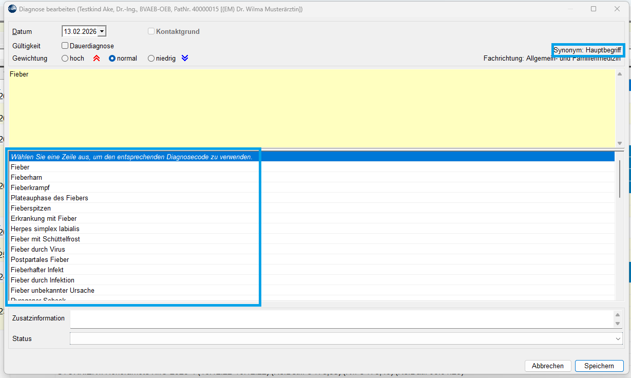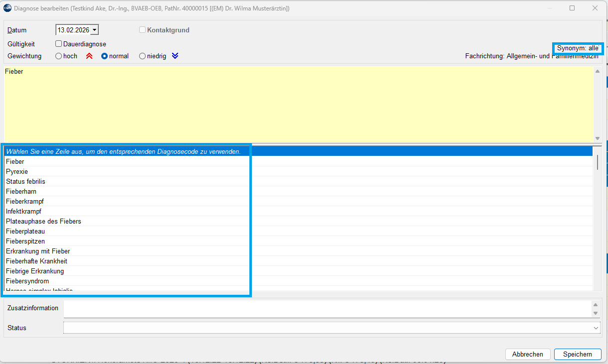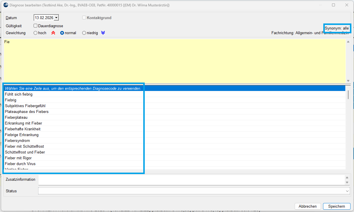 Die Einstellung kann mit einem Klick auf Synonym im Diagnosen-Fenster jederzeit angepasst werden.
