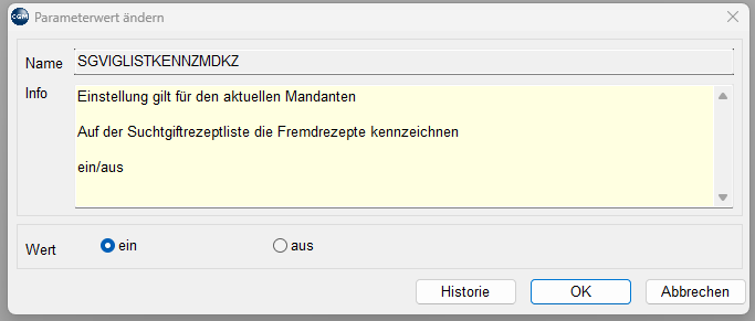 Neuer Parameter SGVIGLISTKENNZMDKZ