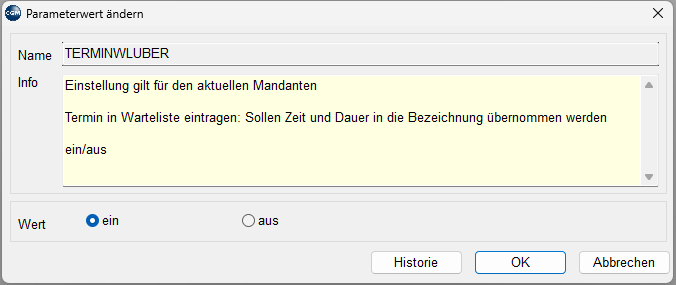 Mit dem neuen Parameter "TERMINWLUBER" kann festgelegt werden, ob die Zeit und Dauer des Termins automatisch in den Wartelistentext übernommen werden soll.