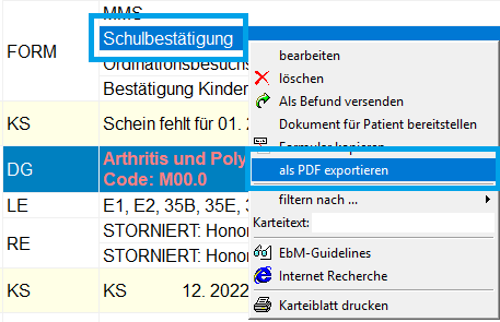 In dieser Programmversion können Dokumente in der Patientenkartei, z.B. „FORM“, per Rechtsklick und Auswahl von Als PDF exportieren als PDF gespeichert werden.