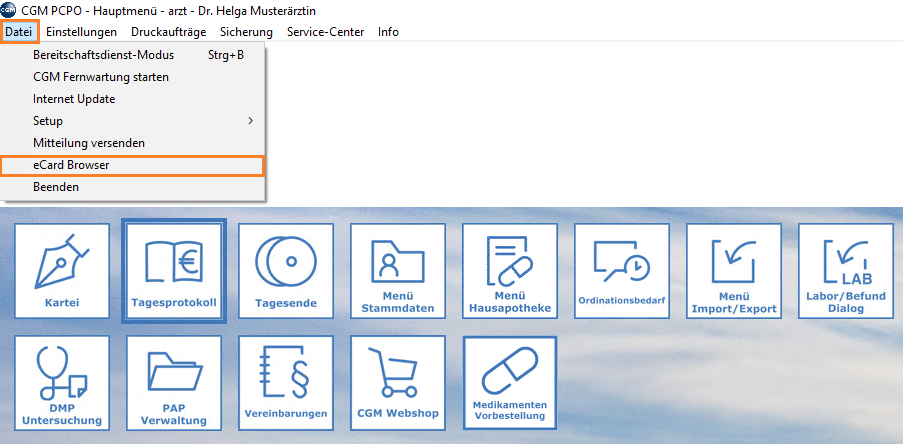 Eine manuelle Abgabe einer offenen e-Rezept-Verordnung kann im e-Card-Browser ("CGM PCPO Hauptmenü" → "Datei" → "eCard Browser") wie folgt vorgenommen werden: