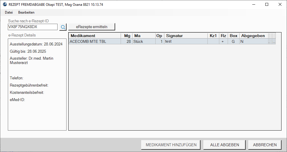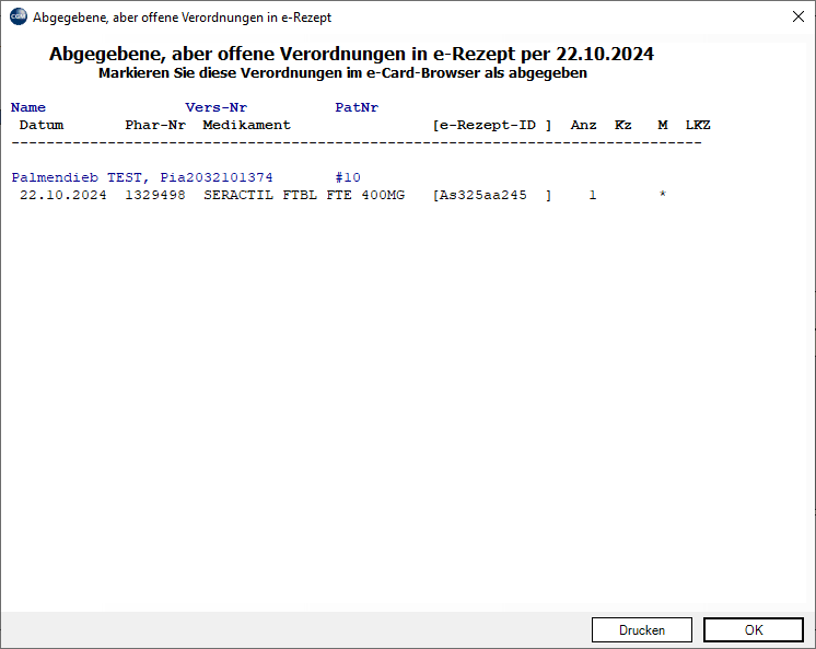 Auf diese Weise entstandene offene Verordnungen müssen im e-Rezept System manuell als abgegeben gekennzeichnet werden!