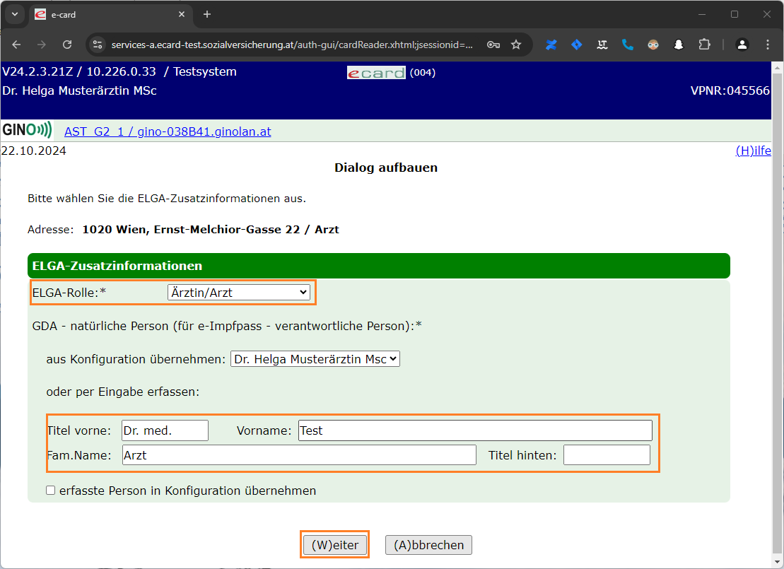 Befüllen Sie die ELGA-Zusatzinformationen und klicken Sie auf "(W)eiter"