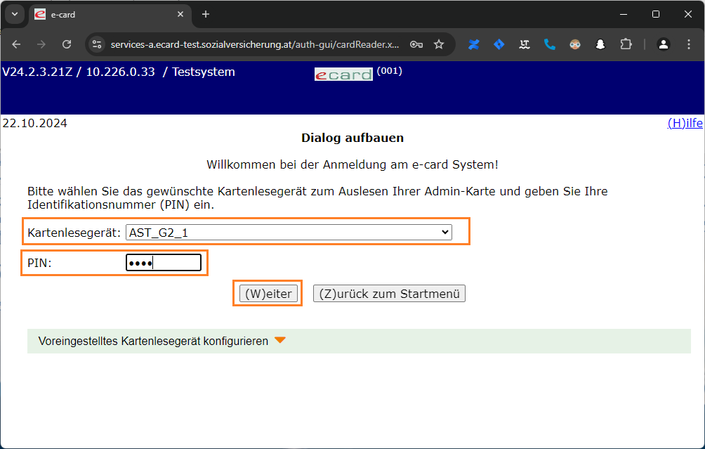 Stecken Sie die Admin-Karte in einen Kartenleser, wählen Sie diesen Kartenleser aus, geben Sie die PIN der Karte ein und klicken Sie auf "(W)eiter".