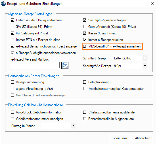 Sollte das automatische Eintragen dieses Kommentars nicht gewünscht sein, so kann dies in der CGM PCPO Patientenkartei in der Rezeptierung unter "Extras" → "Rezept Einstellungen" über die Checkbox "ABS-Bewilligt" in e-Rezept anmerken" deaktiviert werden.
