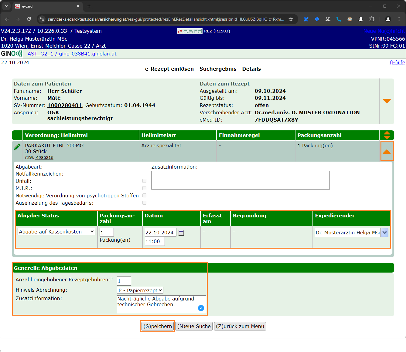 Geben Sie die Anzahl der eingehobenen Rezeptgebühren an, geben Sie als Hinweis für die Abrechnung "P - Papierrezept" an, geben Sie den Grund für die Nacherfassung in das Feld "Zusatzinformationen" ein und klicken Sie auf "(S)peichern".