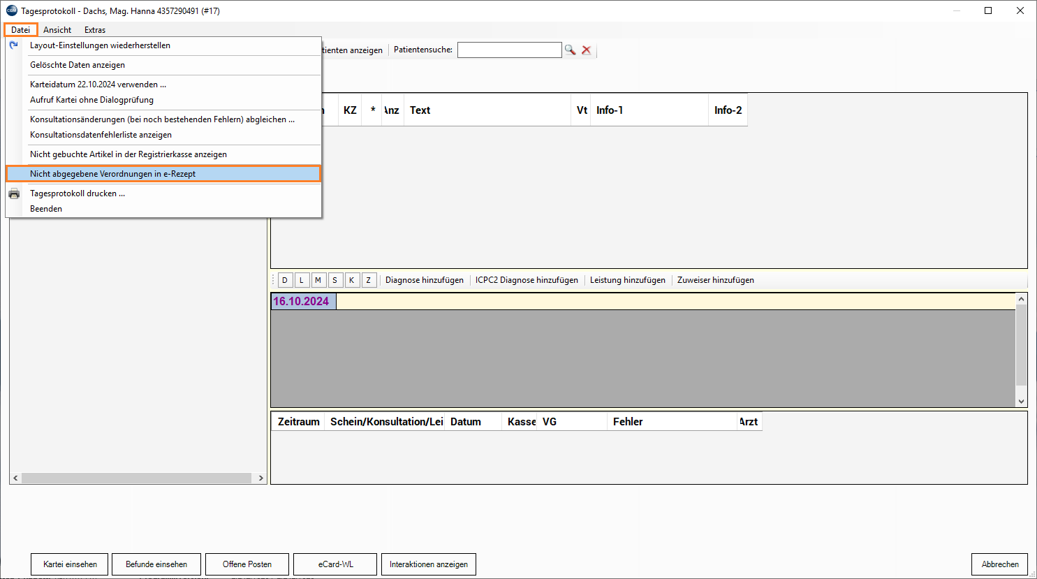 Die Liste kann, nachdem sie geschlossen wurde, erneut über die Menüleiste "Datei" → "Nicht abgegebene Verordnungen in e-Rezept" im Tagesprotokoll aufgerufen werden.