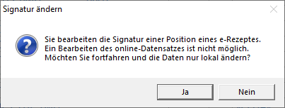 Wird versucht, ein Arzneimittel zu bearbeiten, welches sich auf einem Rezept befindet, das bereits in e-Rezept gespeichert wurde, so wird jetzt ein Hinweis angezeigt.