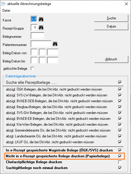Rezepte, die nicht in e-Rezept gespeichert bzw. abgegeben wurden (Papierrezepte), können jetzt im Zuge der Abrechnung gedruckt werden, damit diese, falls vom jeweiligen Versicherungsträger gewünscht, in Papierform an die Abrechnungsstelle geschickt werden können.