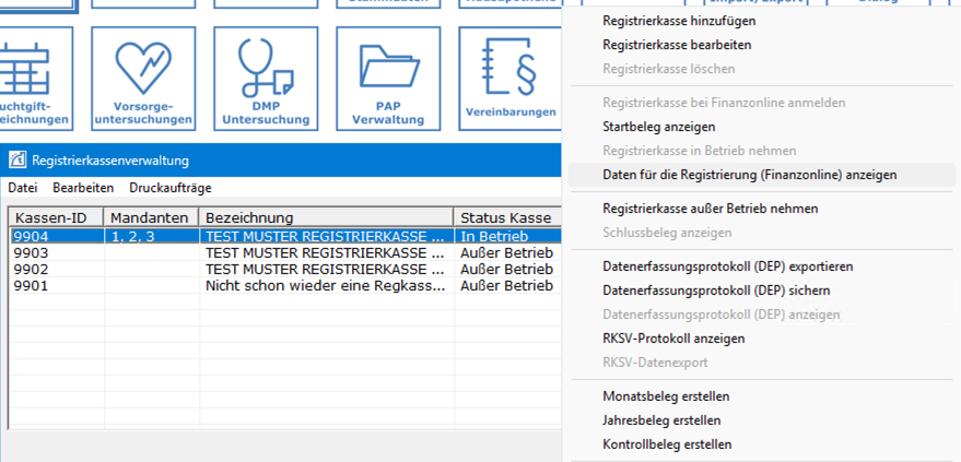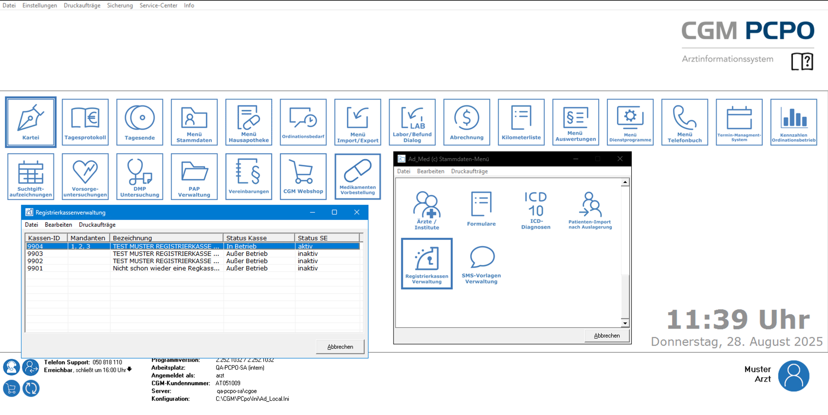 - Öffnen Sie die Registrierkassenverwaltung ("CGM PCPO Hauptmenü" → "Menü Stammdaten" → "Registrierkassen Verwaltung").