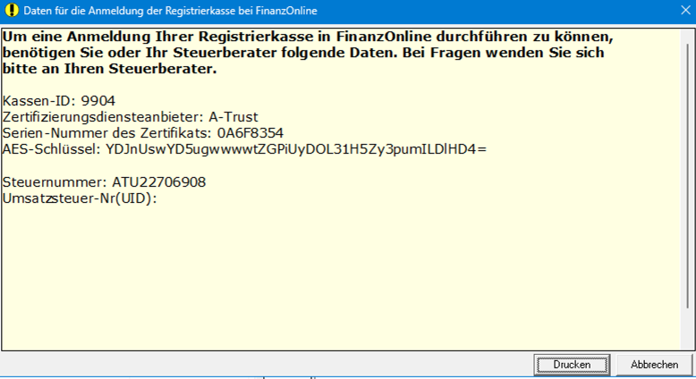- Diese Informationen können auch nachträglich jederzeit über den Menüpunkt "Inbetriebnahme" → "Daten für Anmeldung bei FinanzOnline anzeigen" aufgerufen werden.
