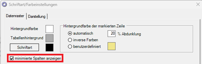 Diese wird entweder minimiert dargestellt und kann mit der Maus breiter gezogen werden, oder aber, es ist zusätzlich eingestellt, dass minimierte Spalten ausgeblendet werden. In diesem Fall öffnen Sie bitte im Hauptmenü -> Menü Stammdaten -> Kassen -> Extras -> Schriftart/Farbeinstellungen und setzen Sie bei der Option „minimierte Spalten anzeigen“ ein Häkchen.