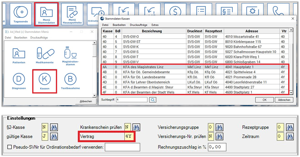 - Aktivieren Sie ggf. den KFA Vertrag, in dem Sie im „PCPO Hauptmenü“ unter „Menü Stammdaten“ -> „Kassen“ bei den Kassen „4A, 4B, 4C, 4D, 4E, 4F“ den „Vertrag“ auf „4Y“ (Allgemeinmedizin) bzw. „4A“ (Facharzt) ändern.