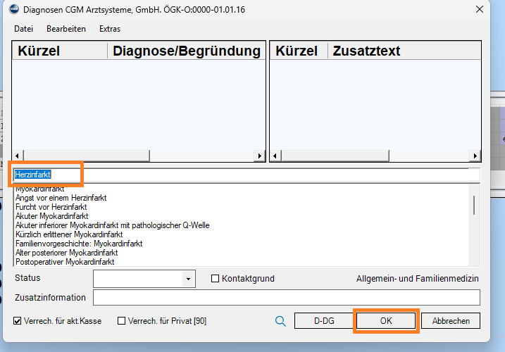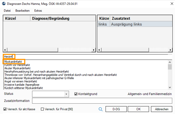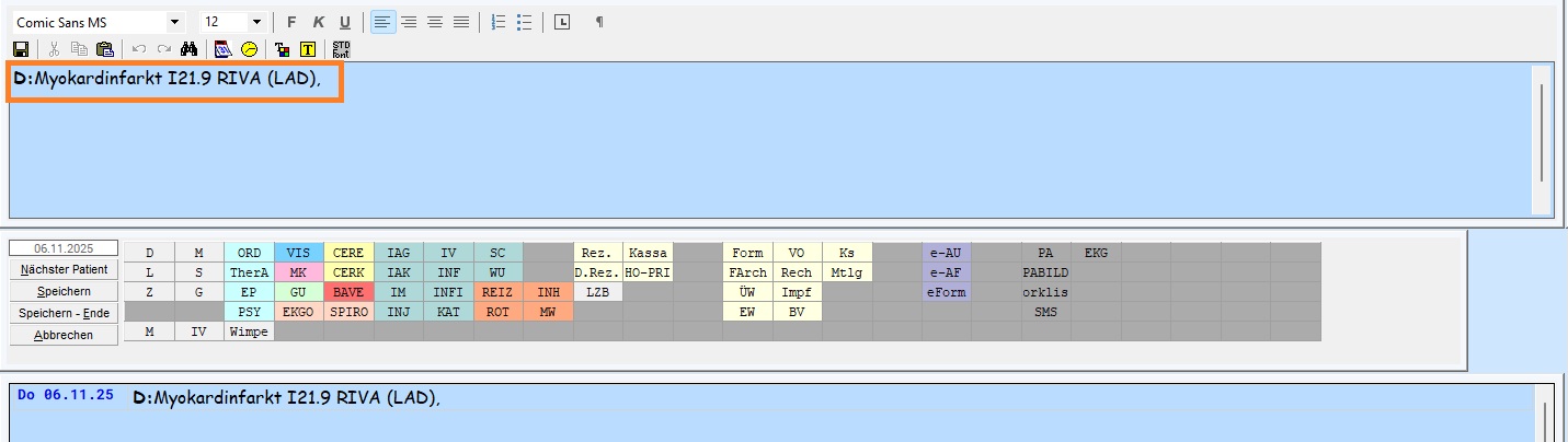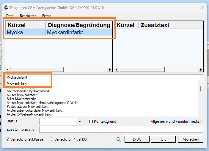 Sie können wie gewohnt Diagnosekürzel verwenden, um eine zügige Erfassung von Diagnosen zu bewerkstelligen.