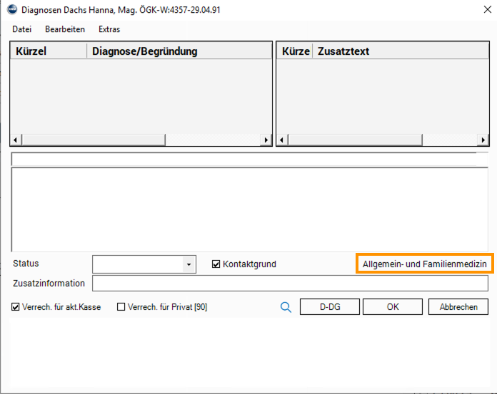 Bei der erstmaligen Eingabe einer Diagnose öffnet sich ein Auswahlfenster für das ÖÄK-Fachgebiet.