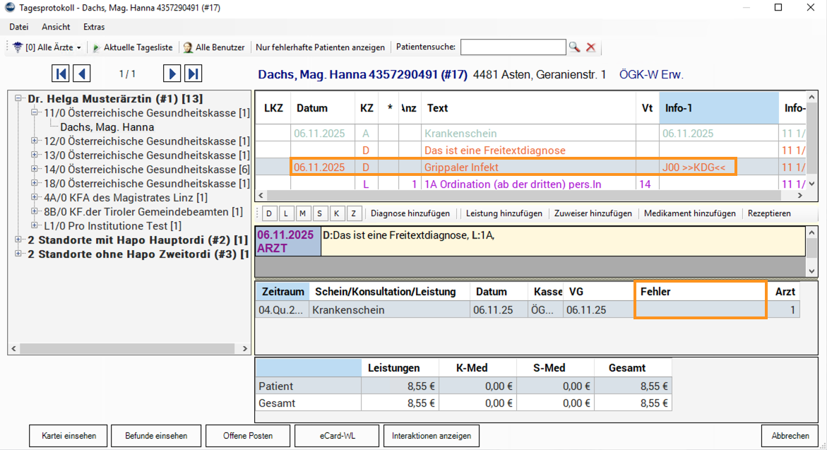 Um eine gesetzeskonforme Dokumentation und Übermittlung codierter Diagnosen sicherzustellen, stehen entsprechende Kontrollfunktionen im Tagesprotokoll sowie in der Abrechnungs-Fehlerliste zur Verfügung.