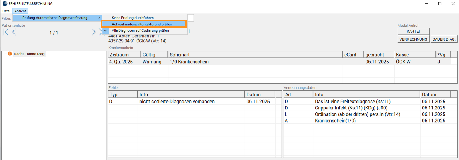 Sofern in den Einstellungen eine Kontrolle auf codierte Diagnosen aktiviert ist (Standard = "Auf vorhandenen Kontaktgrund prüfen"), werden die entsprechenden Informationen im Kontrolllauf analog zur Tageskontrolle angezeigt.