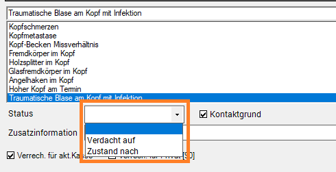 Im Dropdown-Menü "Status" des Diagnosemoduls, kann im Anlassfall ein Attribut ausgewählt werden.