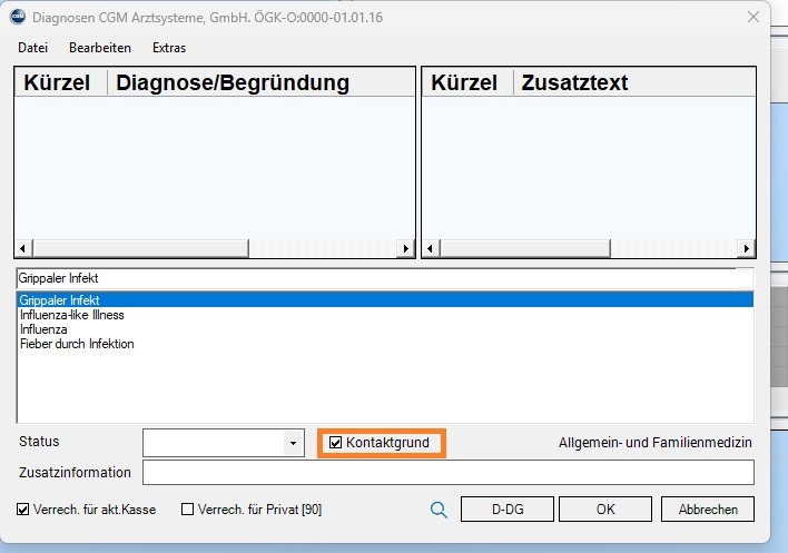 Die tatsächliche Deklaration einer Diagnose als Kontaktgrund erfolgt durch den Anwender mittels Aktivierung/Deaktivierung der entsprechenden Checkbox.