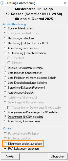 Sollten Sie bereits vor diesem Zeitpunkt eine Übermittlung der Diagnosen in codierter Form wünschen, kann die Checkbox "Diagnosen codiert ausgeben" beim Erstellen eines Abrechnungsdatenträgers aktiviert werden.